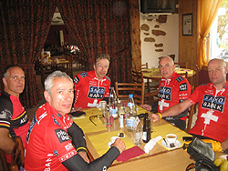 ersten Randonneure ein, die sich ebenfalls reichlich zu Essen und Trinken bestellen.