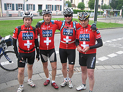 Alle vier tragen dasselbe Outfit (rotes Trikot von Saxo Bank). Da falle ich mit meinem überwiegend